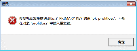 问题描述:速达3系修复账套提示:修复账套发生错误,违反了PRIMARY KEY 约束'pk_profitloss'。不能在对象'profitloss'中插入重