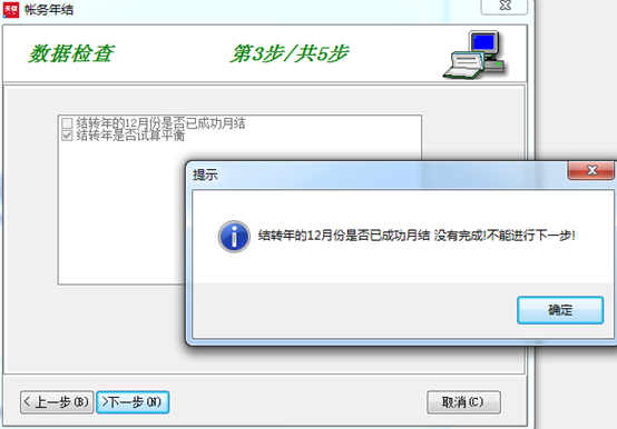 3 、共五步,其间对账套中12 月份财务账作月结。