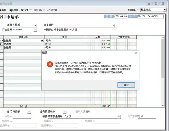 无法为数照库“SD30601圣海灵2019中的对象’dbo.P_ORDERATTACH',’PK_p_orderattach'分配空间,因为‘PRIMAR“文件组已满,请删除不需要的文件、删除文件组中的对象。将其他文件添加到文件组或为文件组中的现有文件启用自动增长,以便增加可用磁盘空间。