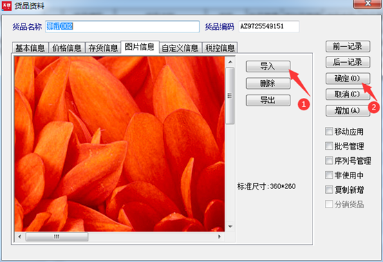 如下,在货品名称“测试002”中导入图片,确定。在货品资料“测试001”中变成了刚才导入的图片。